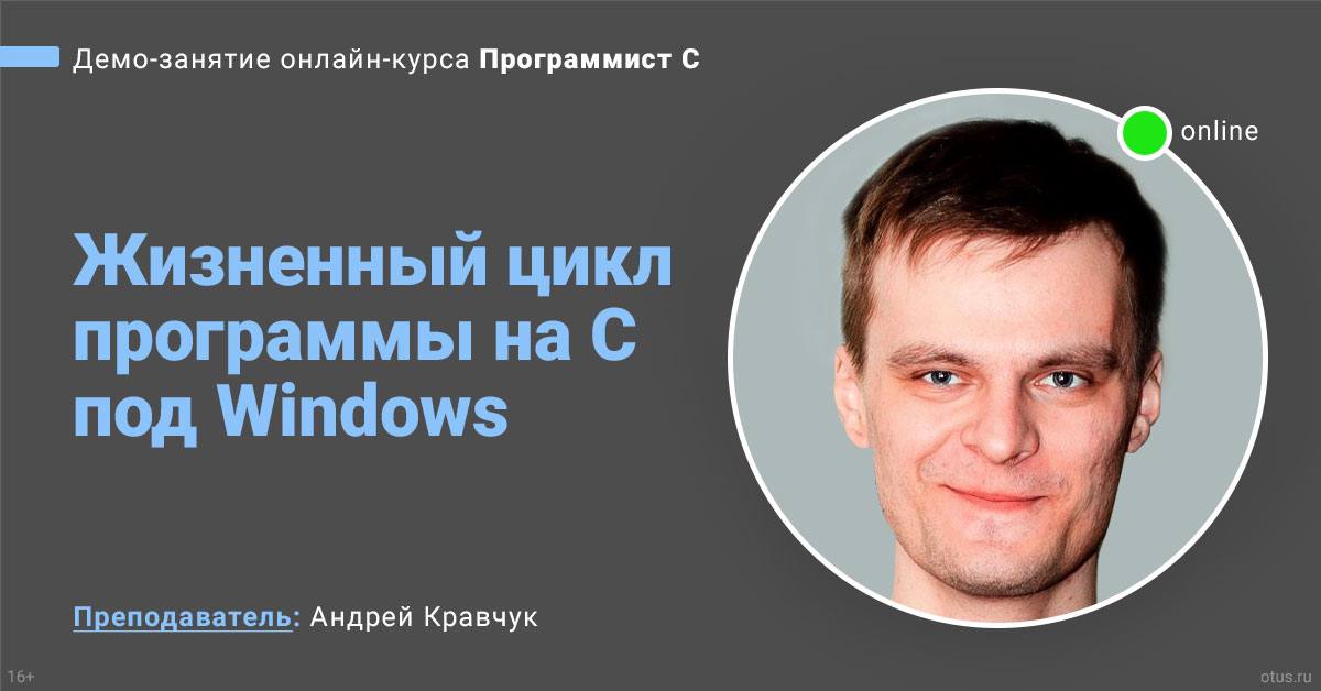 За 1,5 часа вы с Андреем Кравчуком, разработчиком в RavenPack International, рассмотрите полный жизненный цикл программы на языке C под ОС Windows, начиная от исходного кода и заканчивая загрузкой готового exe-файла. По ходу дела посмотрите «под капот» различным низкоуровневым механизмам операционной системы и тулчейна компиляции и познакомитесь с инструментами для анализа программ.