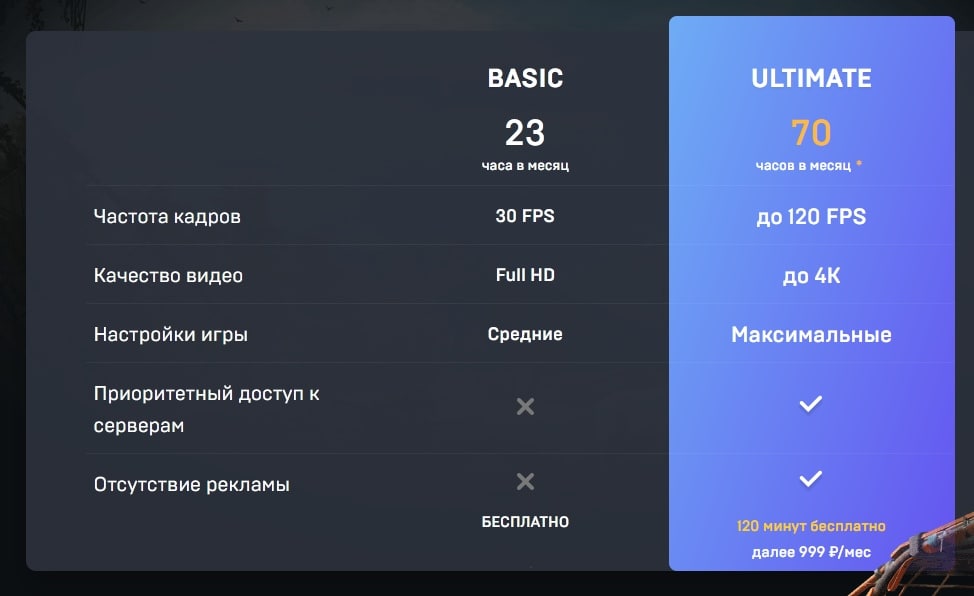 - Платно — 70 часов в месяц и далее платить по рублю за минуту, на максимальных настройках, до 4К, с частотой до 120 кадров в секунду, с приоритетным доступом к серверам и без рекламы