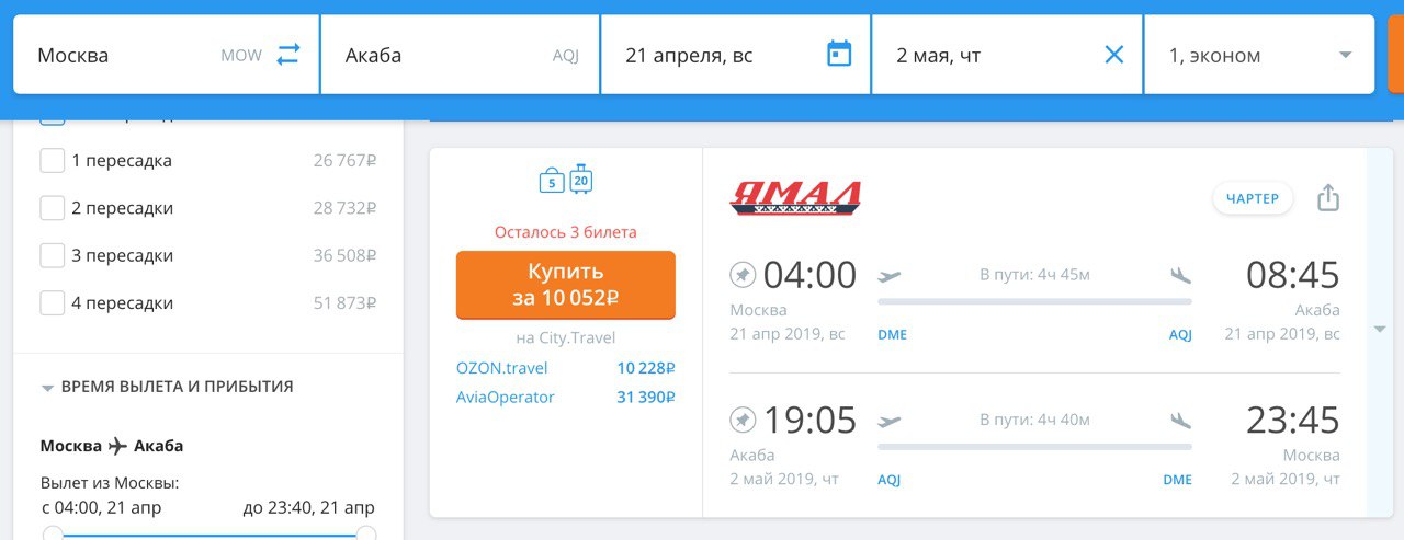Чартер в Акабу за 10000 рублей из Москвы туда и обратно