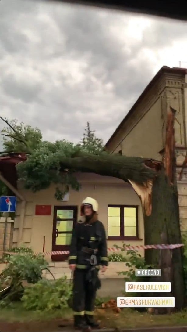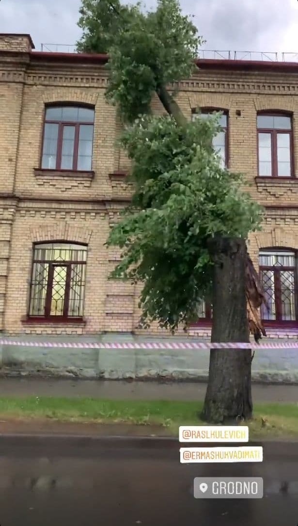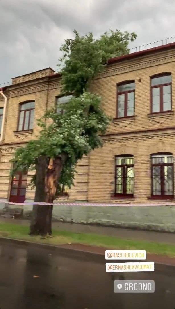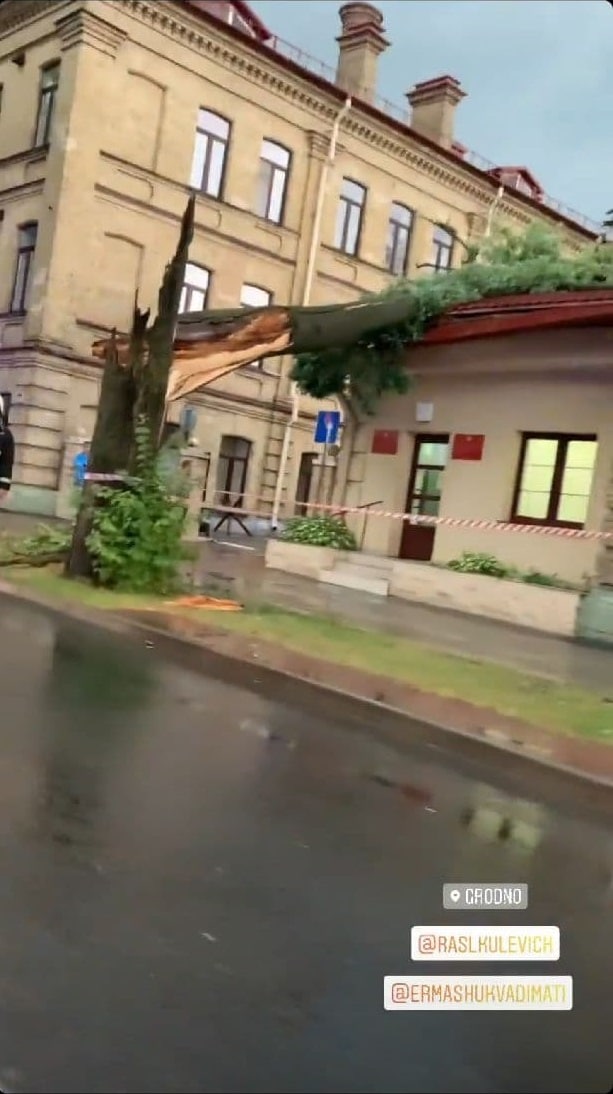 У Горадне ў сувязі з моцным ветрам і дажджом на гістарычныя будынкі вайсковага шпіталя на вуліцы Дзяржынскага, 19 звалілася некалькі дрэваў.