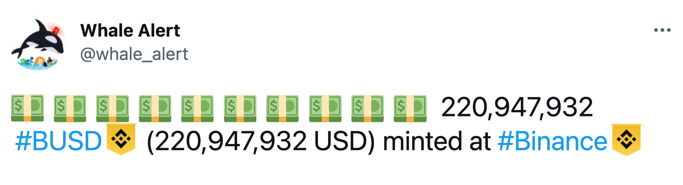 Вчера вечером Binance выпустила 220 миллионов долларов в собственном стейблкоине BUSD, о чём сообщил Твиттер-бот Whale Alert. Представители криптовалютного сообщества в ответ пошутили, что эти деньги пойдут на недавнее вложение биржи в издание Forbes. https://2bitcoins.ru/binance-investirovala-v-forbes/