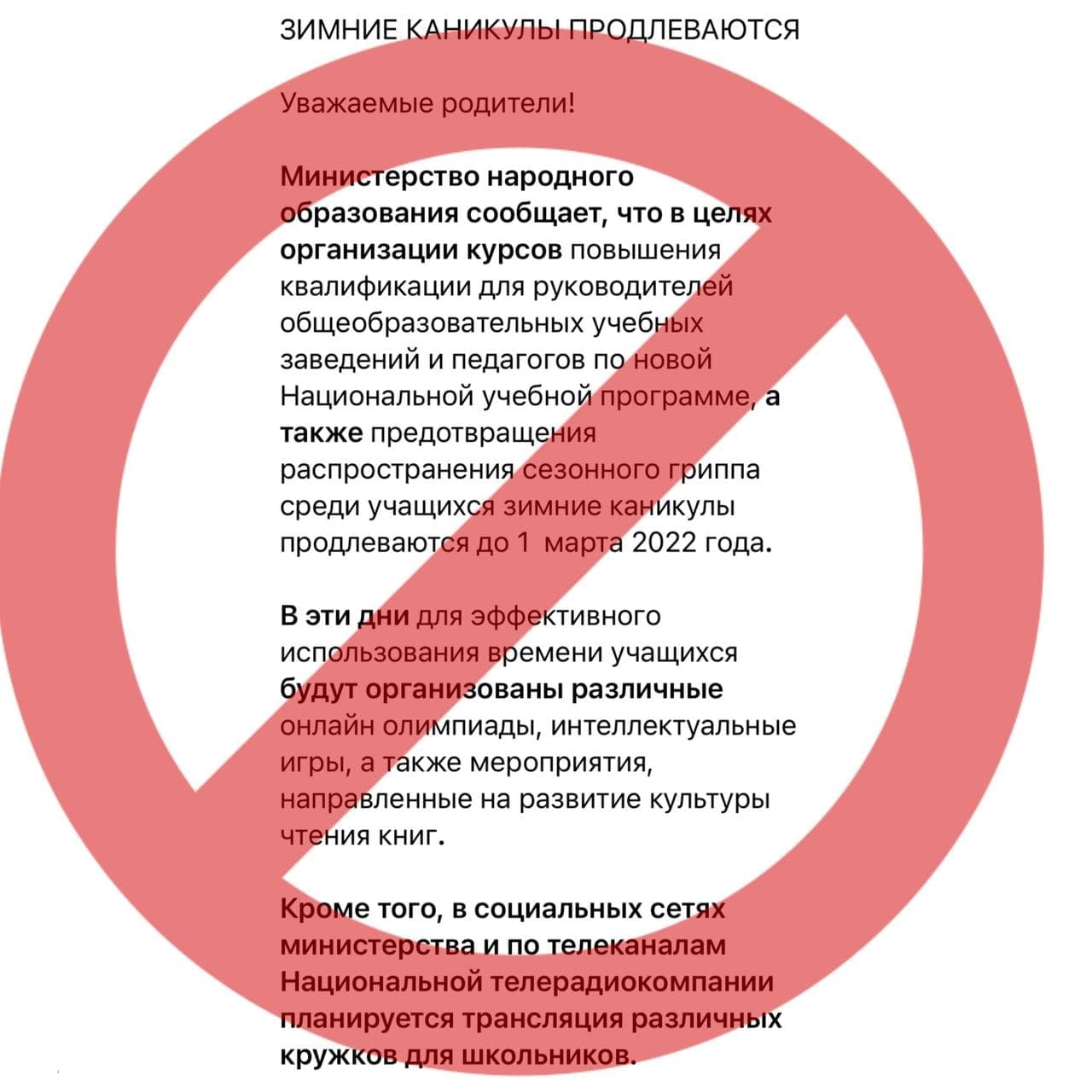 Министерство народного образования сообщило, что зимние каникулы продлеваются до 24 января для того, чтобы предотвратить распространение сезонного гриппа среди учащихся. Кроме того, в это время будут организованы курсы повышения квалификации для руководителей общеобразовательных учебных заведений и педагогов по новой Национальной учебной программе.
