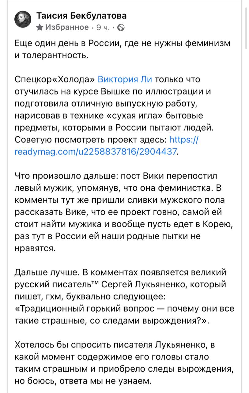 пришли оскорблять корреспондентку журнала «холод» Вику - по причине того что она феминистка и нерусская. Велели ей ехать обратно в свою Корею.