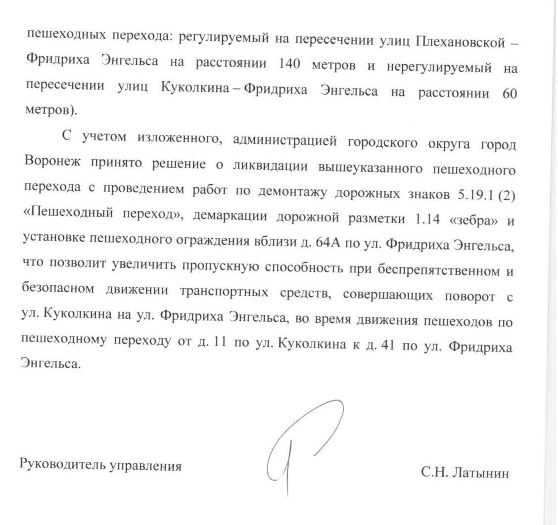 Ознакомившись с результатами исследования пешеходных и транспортных потоков, проведённого сообществом Удобный Воронеж [1]. А также ознакомившись с п. 4.5.2.1 ГОСТ Р 52766-2007, я считаю необходимым:
