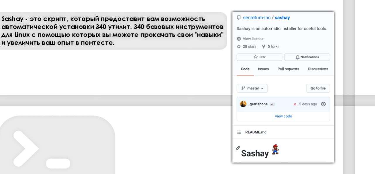 Этот репозиторий представляет собой краткий обзор того, что вам нужно для изучения пентеста, а также набор хакерских инструментов, ресурсов и ссылок для практики этического хакинга. Несколько советов от автора репозитория: