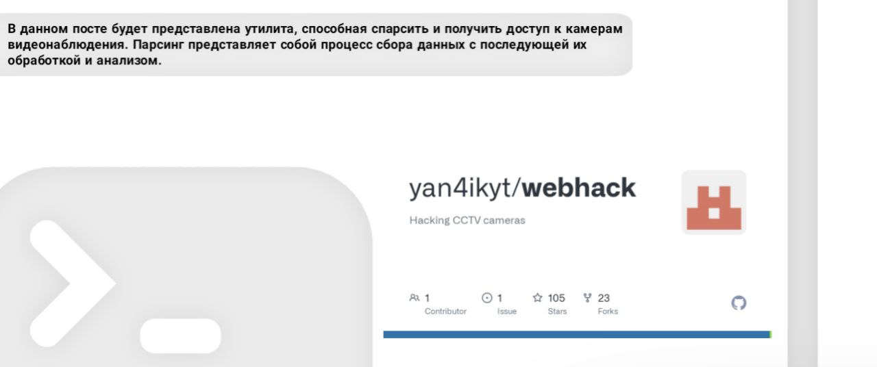 В данном посте будет представлена утилита, способная спарсить и получить доступ к камерам видеонаблюдения. Парсинг представляет собой процесс сбора данных с последующей их обработкой и анализом.