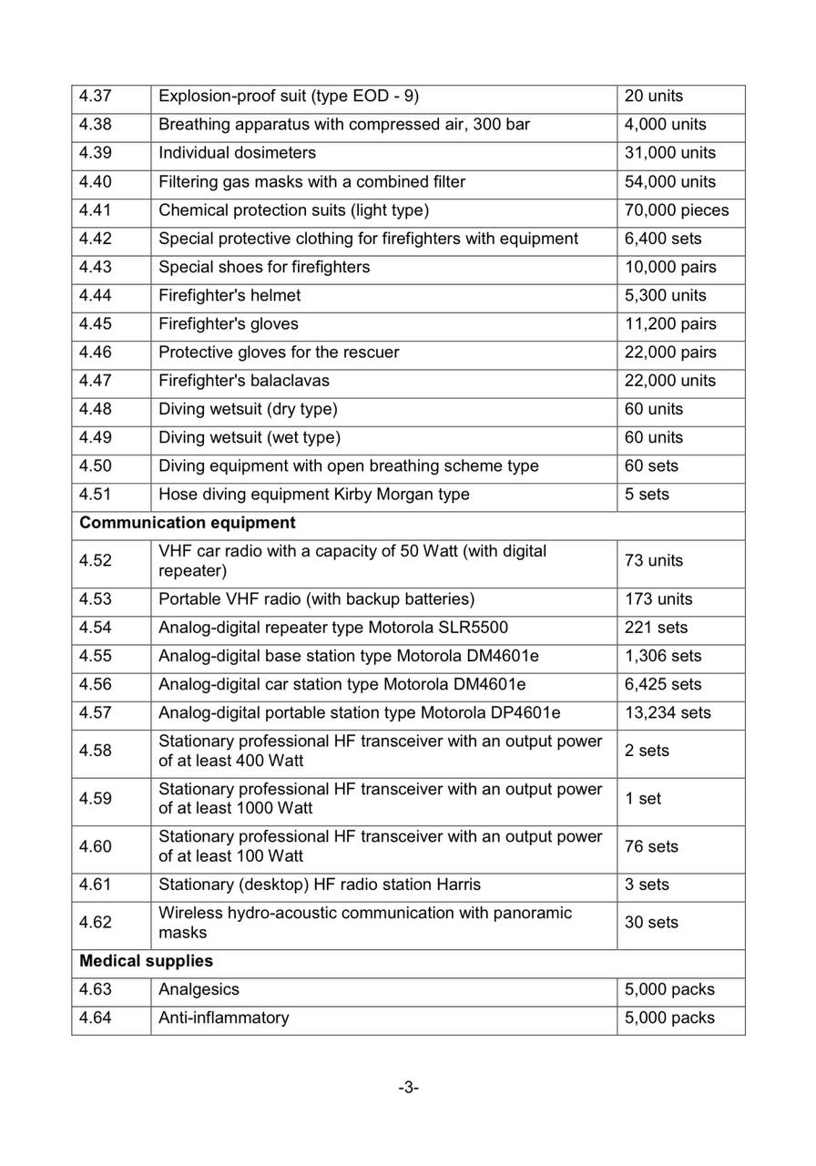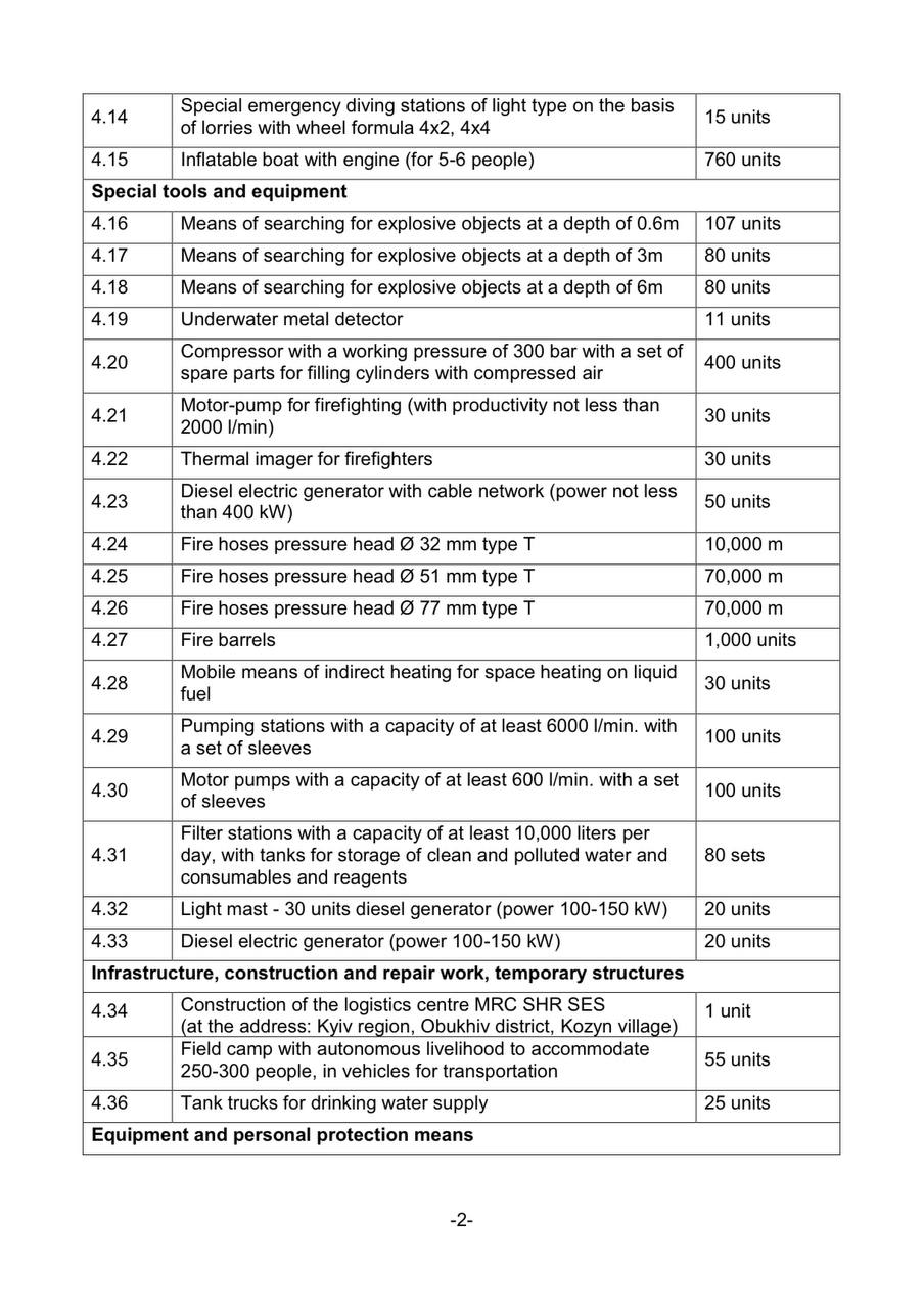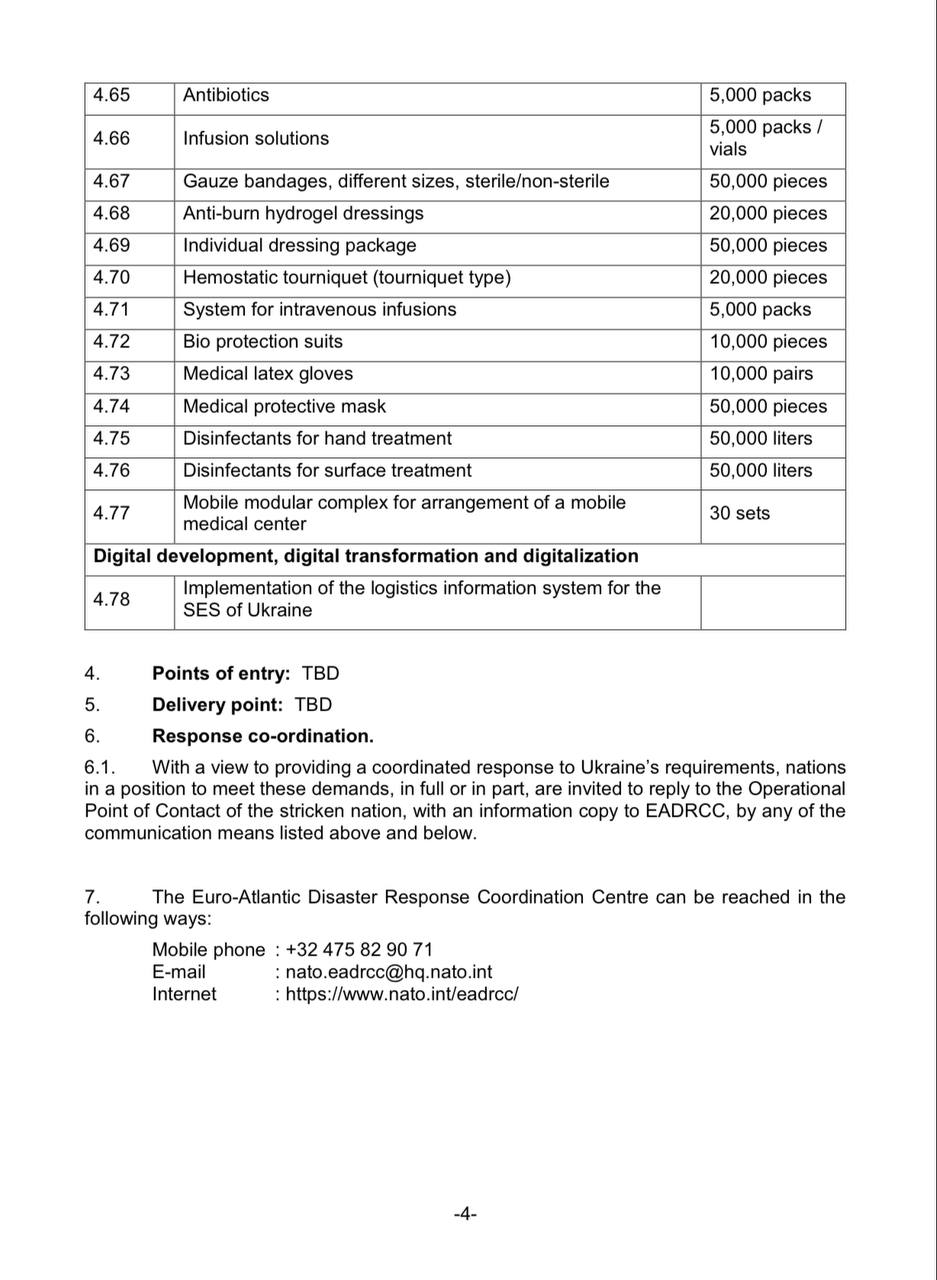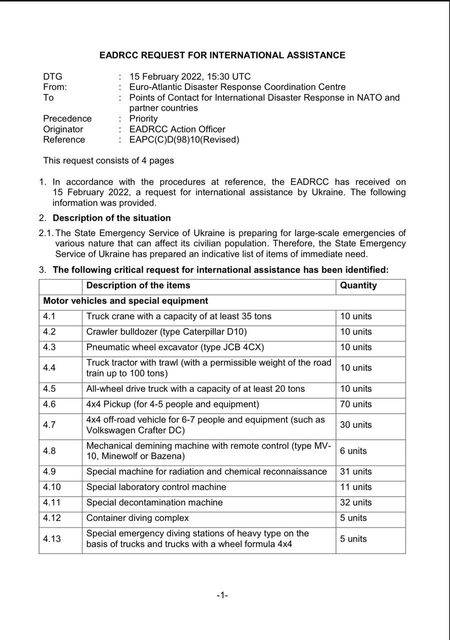 Украина запросила у НАТО краны, экскаваторы, пикапы, внедорожники, машины радиохимической разведки, костюмы химзащиты, мобильные лаборатории, системы поиска взрывоопасных предметов на глубине 0,6, 3 и 6 метров, генераторы, обогревательные пушки, баллоны с кислородом, индивидуальные дозиметры, снаряжение для подводных работ, антибиотики, перчатки, маски, различные медикаменты от ожогов…