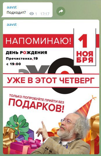 Несмотря на то, что Алексей Алексеевич снова спутал окна чата и уже удалил разошедшуюся по каналам афишку, мы его понимаем и поздравляем с первой соточкой в Телеграме.