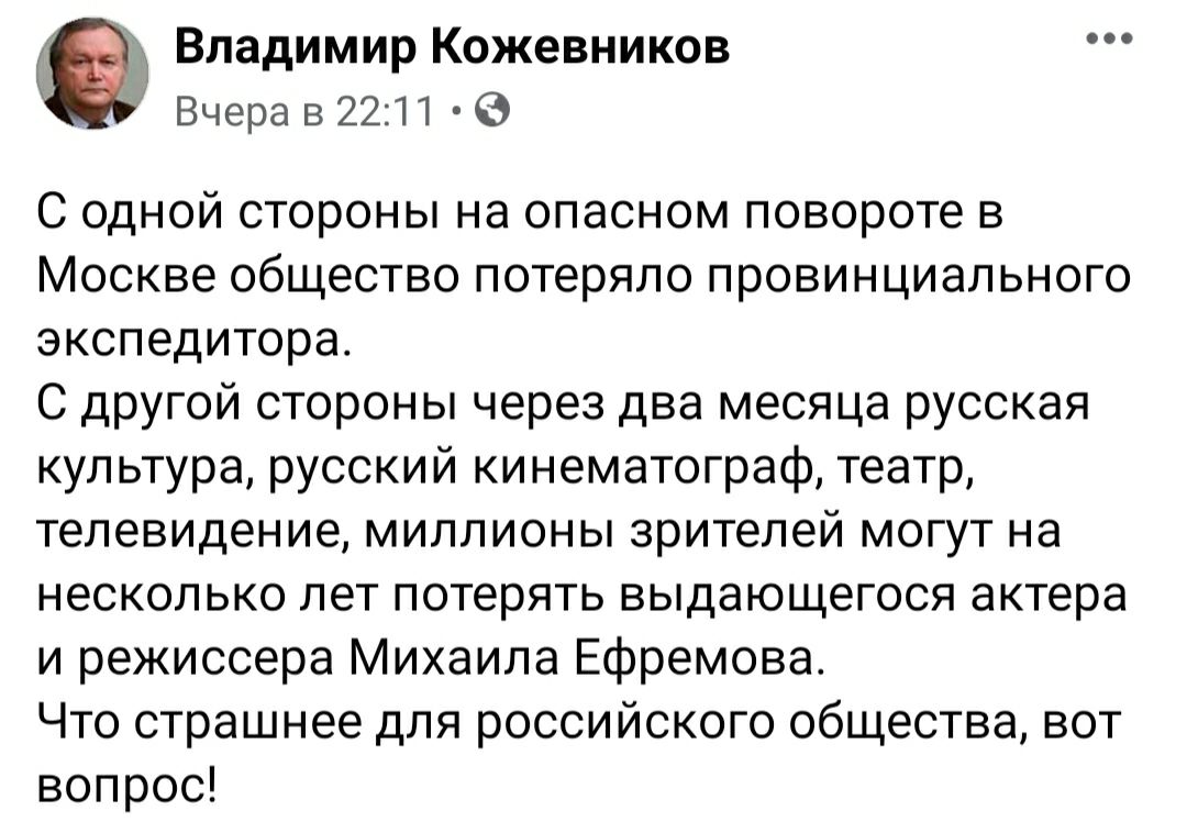 Многие сейчас заговорили о некоей «травле» Ефремова. Мол, надо пожалеть бедного человека, попал в такую страшную историю – врагу не пожелаешь.