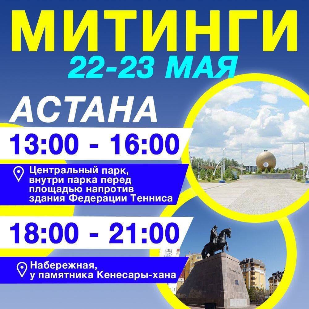 🔵 В Астане митинги 22 и 23 мая пройдут с 13:00 до 16:00 внутри Центрального парка перед площадью напротив здания Федерации Тенниса. А с 18:00 до 21:00 мы соберёмся на Набережной возле памятника Кенесары-хана.