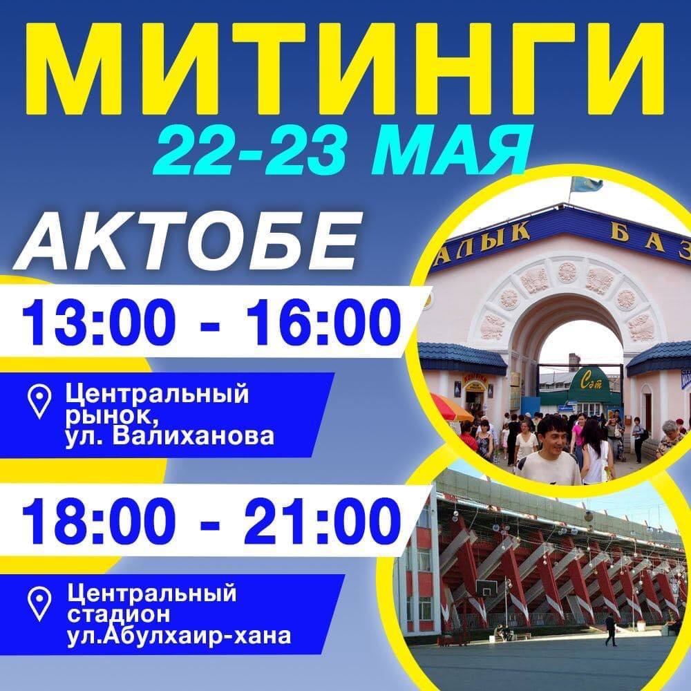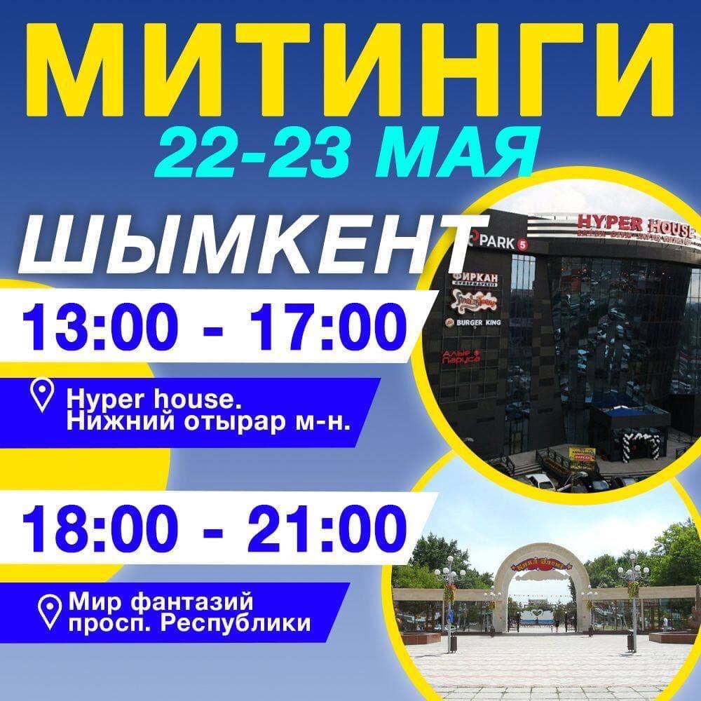 🔵 В Шымкенте митинги пройдут 22 и 23 мая с 13:00 до 17:00 у входа в Hyper hous (м-н Нижний отырар). А с 18:00 до 21:00 мы соберёмся на проспекте Республики у Мира фантазий.