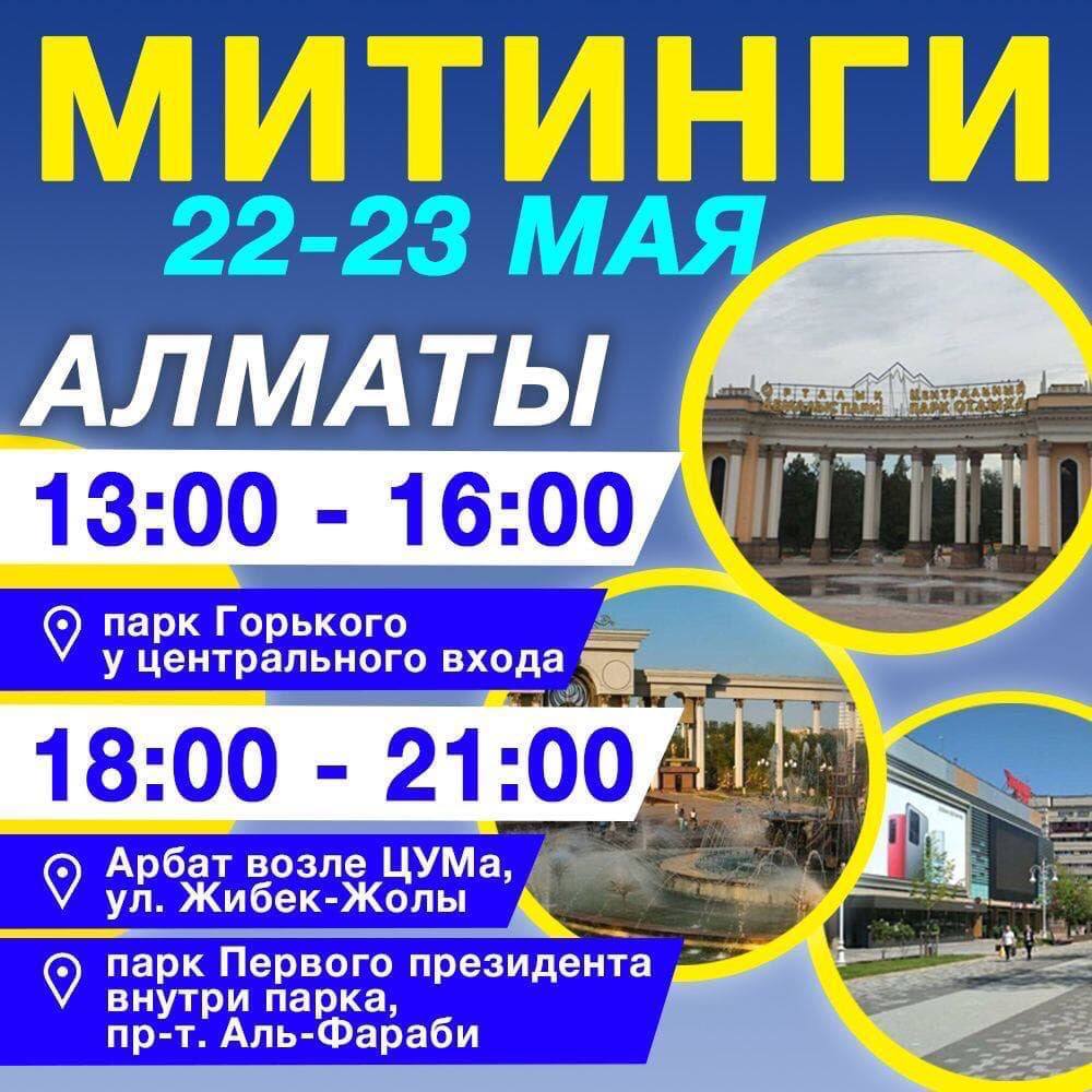🔵 В Алматы митинги 22 и 23 мая пройдут с 13:00 до 16:00 парка Горького у центрального входа ул. Гоголя. А с 18:00 до 21:00 мы соберёмся на Арбате возле ЦУМа (ул. Жибек-Жолы) и внутри парка Первого президента у центрального входа (пр-т. Аль-Фараби).