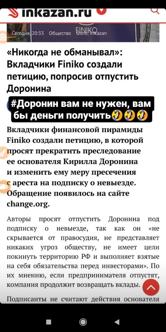 13 июля финансовая пирамида «Финико» объявила о приостановке выплат и запросила у клиентов документы, подтверждающие происхождение вложенных средств... Основатель пирамиды Кирилл Доронин получил гражданство Турции и купил недвижимость в Таиланде. Его местонахождение в настоящий момент неизвестно.