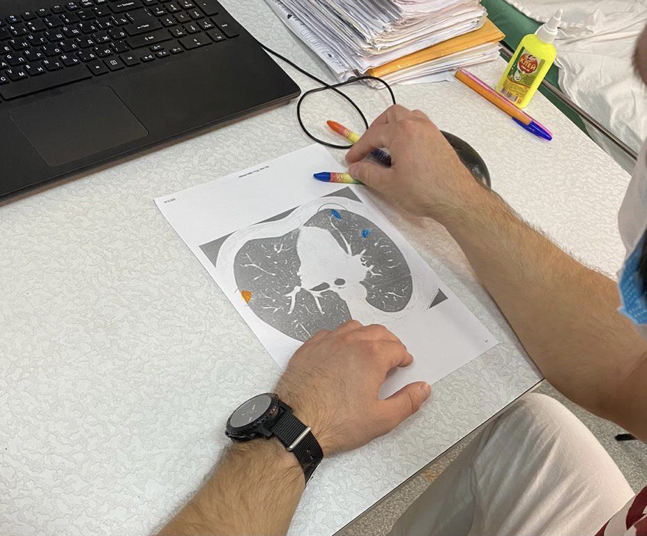 Пациентам Красноярской краевой клинической больницы предлагают закрасить яркими маркерами распечатки снимков их легких. В тех местах, где видны поражения легких. Когда человек понимает, с чем конкретно он борется, ему становится легче психологически. А это хорошо влияет на выздоровление, — отмечают врачи.