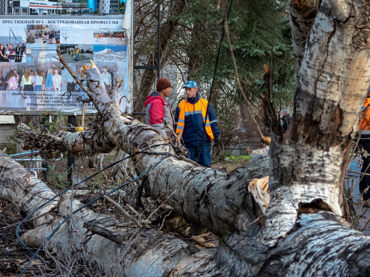 Полтора десятка деревьев повалило ураганом на территории симферопольских парков и скверов. Вырванный с корнем тополь, упавший в Детском парке,