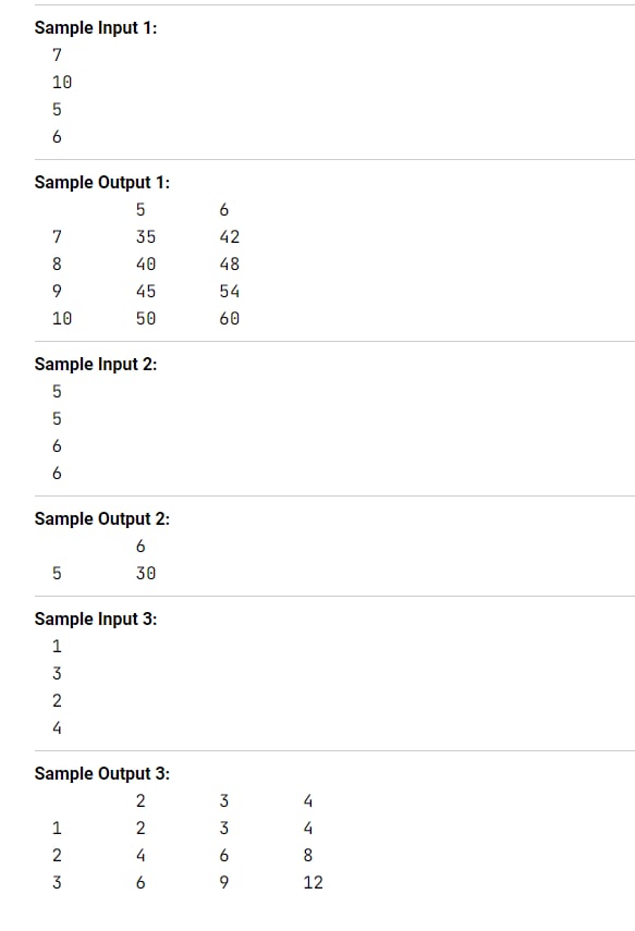 Напишите программу, на вход которой даются четыре числа aa, bb, cc и dd, каждое в своей строке. Программа должна вывести фрагмент таблицы умножения для всех чисел отрезка [a; b][a;b] на все числа отрезка [c;d][c;d].