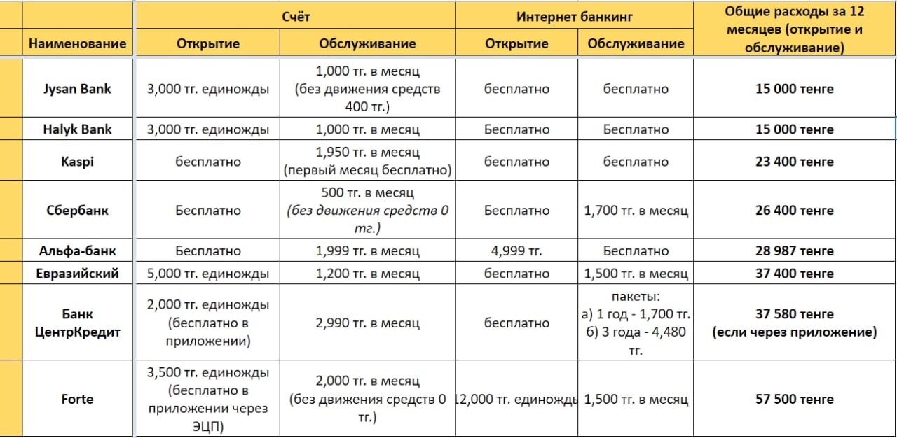Пост подготовлен для тех, кто собирается открыть ИП, ТОО, или просто задается вопросом о том, не дорого ли обходится вашей компании ведение счета в банке.