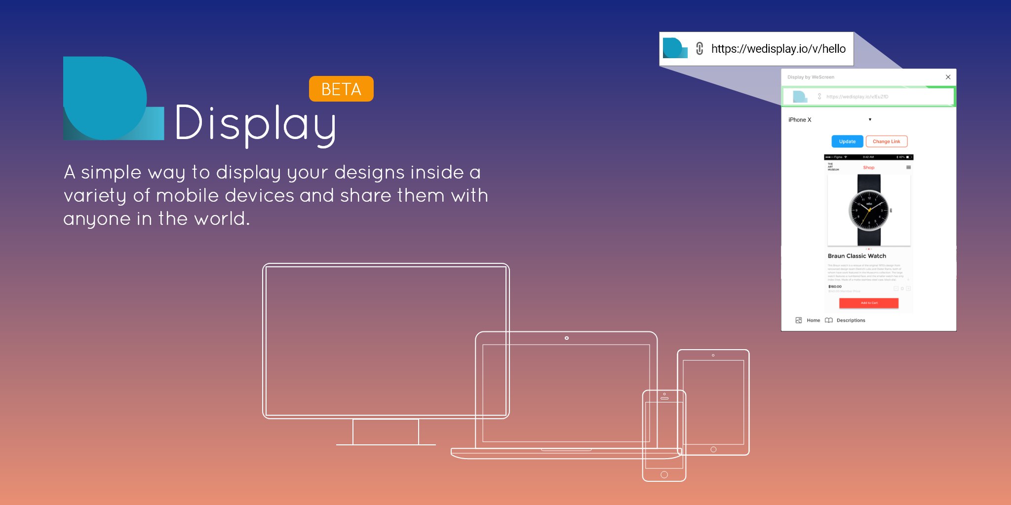 Display by WeScreen — простой способ показать свой дизайн на различных устройствах и с возможностью поделиться ссылкой на нужное разрешение макета.