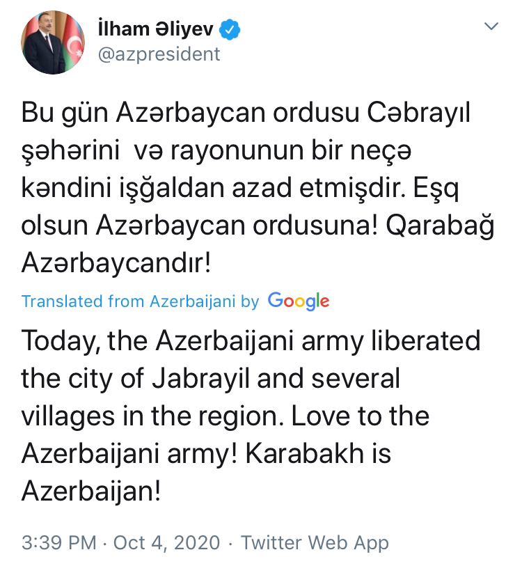 «По моему приказу сегодня Армия обороны нанесла несколько ракетных ударов с целью обезвреживания военных объектов в городе Гянджа. На данный момент я поручил прекратить огонь во избежание невинных жертв среди гражданского населения. В случае, если противник не сделает соответствующих выводов, мы продолжим соразмерные и мощные удары, дезорганизуя и разрушая вражескую армию и тыл».