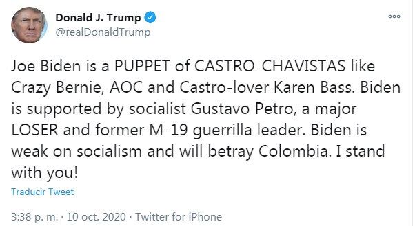 Трамп обозвал Байдена марионеткой кастровцев и чавистов типа «Сумасшедшего Берни» и Карена Басса, а также будущим предателем Колумбии