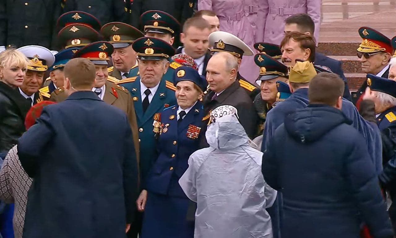 Путин помог ветерану-зрителю парада Победы в Москве поправить куртку. В столице сейчас действительно прохладно и пасмурно.