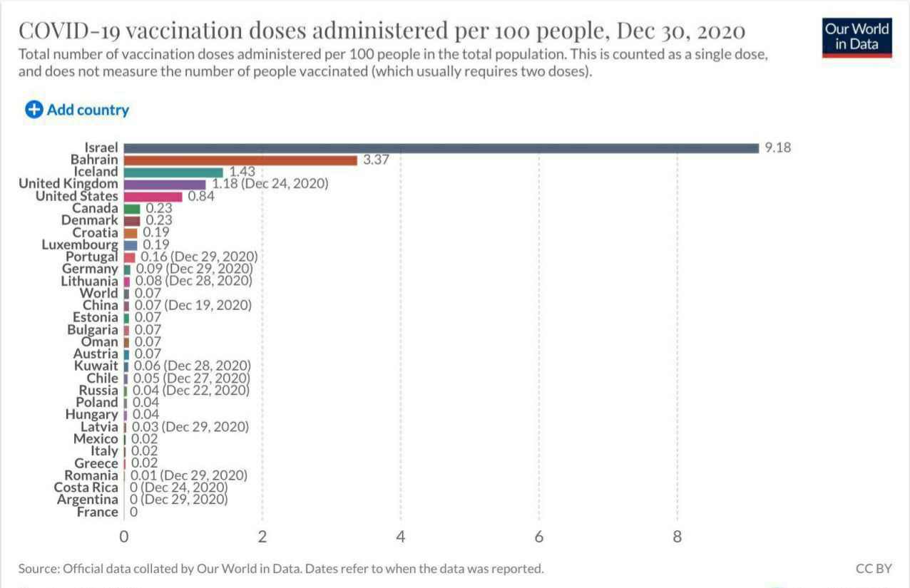 Ну и хорошие новости: на сегодняшний день в Израиле вакцинацию уже прошли 495 тысяч человек (первая доза). Минздрав вышел на 100 тысяч прививок в день. Пока речь идет только о группах риска и медиках. Для 9-миллионной страны - это очень серьезный показатель. Израиль с отрывом впереди планеты всей.
