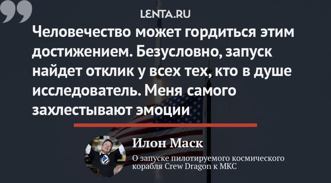 🛸 Герой дня Илон Маск рассказал о гордости после запуска Crew Dragon к МКС. Теперь главная задача — безопасно вернуть астронавтов на Землю и сделать такие полеты регулярными