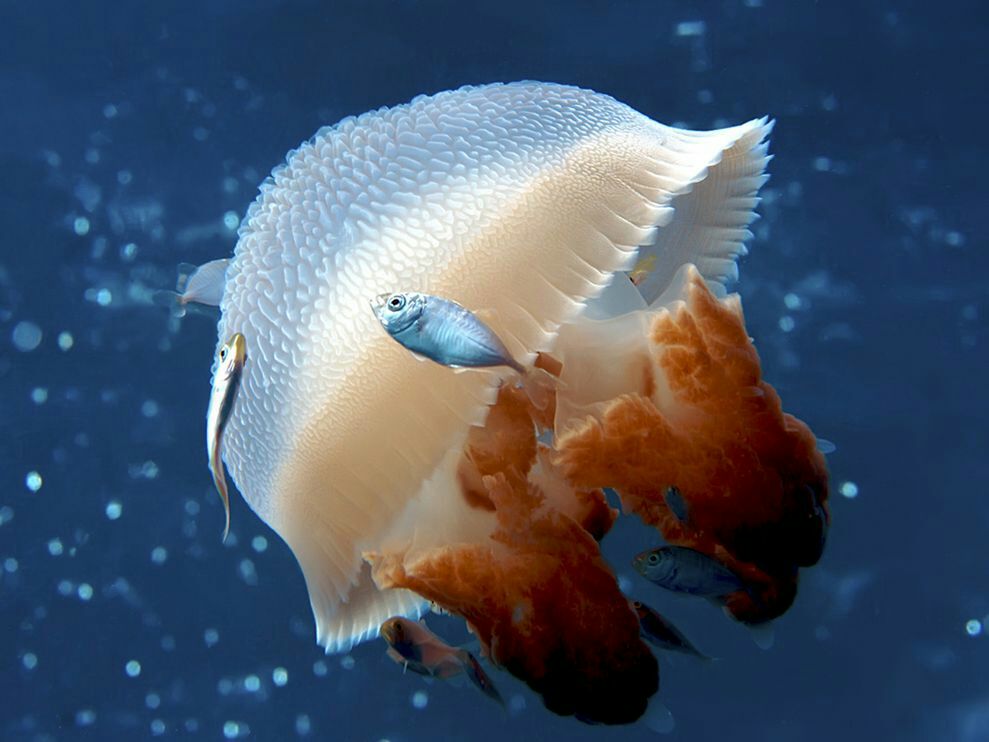 A mosaic jellyfish floats serenely in the waters of the Coral Sea, about 100 nautical miles from Cairns, Australia. Jellyfish are ubiquitous in the Earth’s oceans.