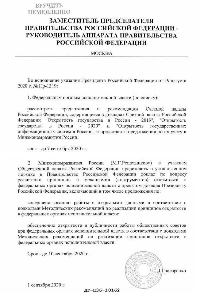 А в ставшем сегодня доступным документе говорится о том, что федеральным органам власти поручено проанализировать рекомендации из доклада Счетной Палаты и представить предложения по их учету, а Минэкономразвития также необходимо продумать, как совершенствовать работу с открытыми данными и что делать с общественными советами (эффективность которых также сильно снизилась).