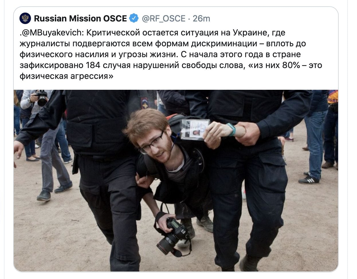 Постоянное Представительство РФ при ОБСЕ в своем Твиттере осуждает Украину за насилие над журналистами. В качестве иллюстрации дипломаты поставили фотку, где российского журналиста Давида Френкеля тащат питерские менты. Это просто лолкек
