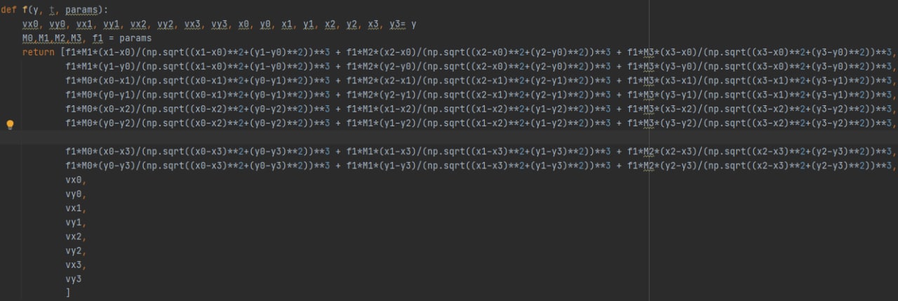 Ребят, как можно динамически изменять систему ОДУ в зависимости от количества материальных точек(odeint или solver_ivp)? Есть вот такой код, при добавление материальной точки добавляется соответствующие слагаемое + 2 уравнение