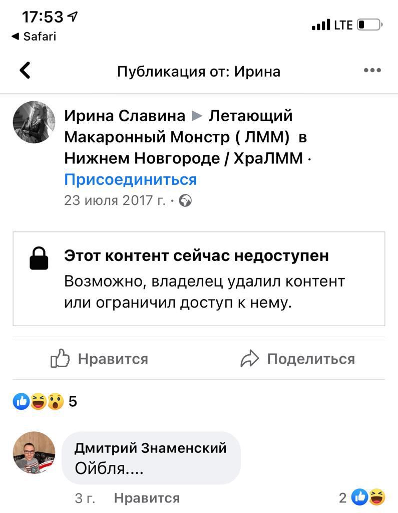 Так было и со Славиной. Она не совершала преступлений, но общалась с людьми из какого-то нелепого «Храма макаронного монстра», под который копали местные силовики. Большая угроза для государственности, да.