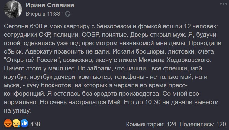 Вчера у Славиной прошёл обыск. В ходе него у журналистки изъяли личные вещи. Сегодня перед самоубийством она написала у себя в Фейсбуке: «В моей смерти прошу винить Российскую Федерацию».