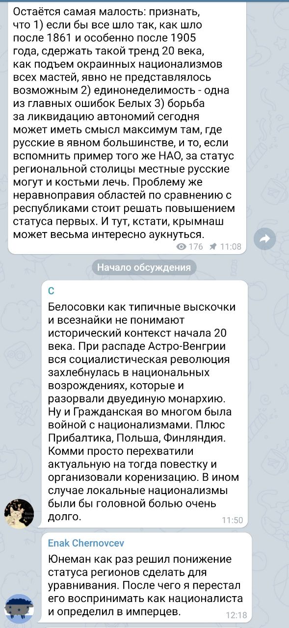 Кстати, симптоматично, что подобные высказывания притягивают таких дурачков как на скрине, один заливает про Австро-Венгрию, где, по сути, не было национального большинства, а было несколько крупных народов. А второй микронационалист, что-то там пишет про имперство, проблема в том, что такие Енаки никогда не поймут взрослые народы, которых немного в мире, потому что они другой системой ценностей, даже поляков не поймут и почему они проводят международную экспансию, а не окукливаются и ложатся под Брюсель. Поэтому с хуторянами и овцепасами говорить не о чем, каждому своё. Национализм не противоречит империи, просто национализм есть имперский, а есть для свинопасов и овцеложцев.