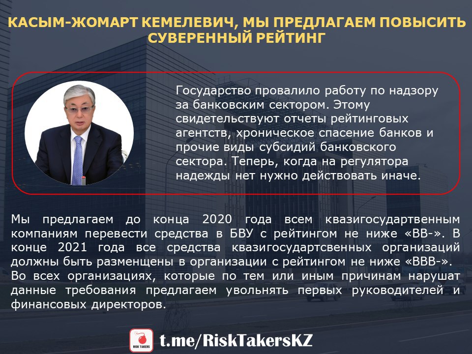 В-третьих, мы ещё раз хотим обратить внимание регулятора на суверенный рейтинг страны. Казахстану не удаётся повысить страновой рейтинг из-за высоких дисбалансов в экономике, чрезвычайно высоком кредитном риске и нестабильном банковском секторе.