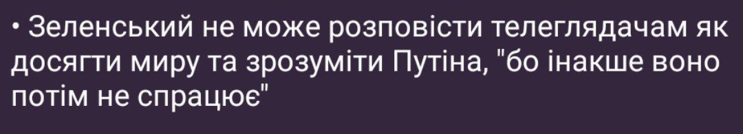 • Зеленський не може розповісти телеглядачам як досягти миру та зрозуміти Путіна, "бо інакше воно потім не спрацює"