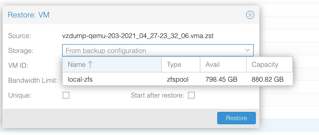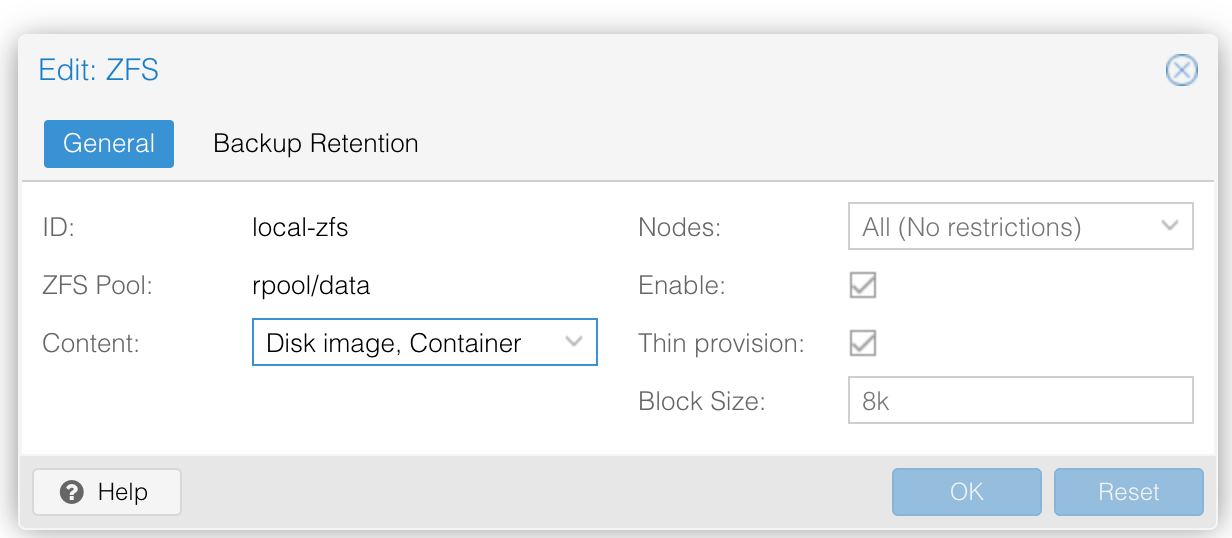 в доке об этом явно не говорится. При установке прокса с нуля и автоматическом создании ZFS пула прокс по умолчанию все ВМки так и создаёт. Если пул добавляется позже, то пул подключается в Storages и для него указывается что на нём могут размещаться Disk Image и задаётся размер блока по умолчанию